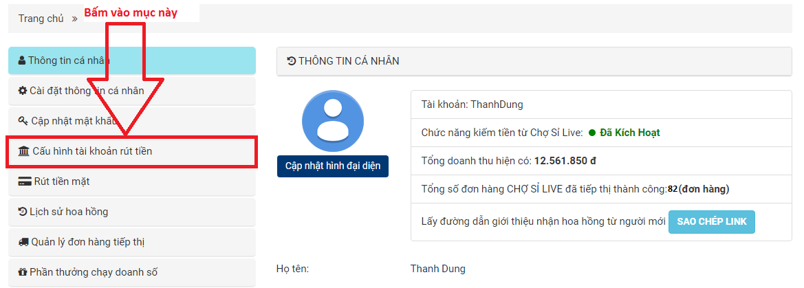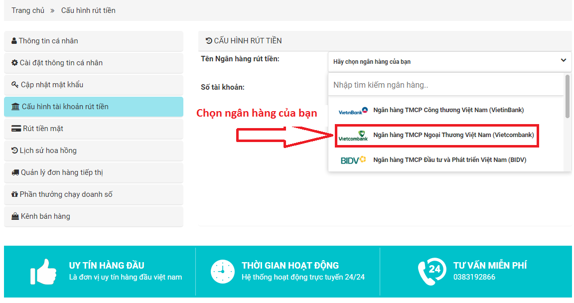 + Bước 2: Bấm vào mục " Cấu hình tài khoản rút tiền"