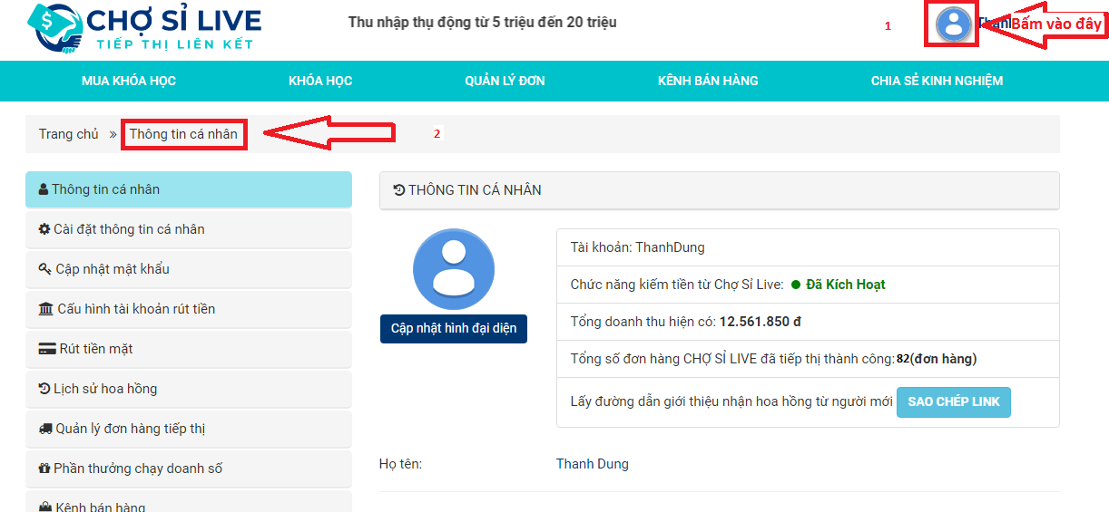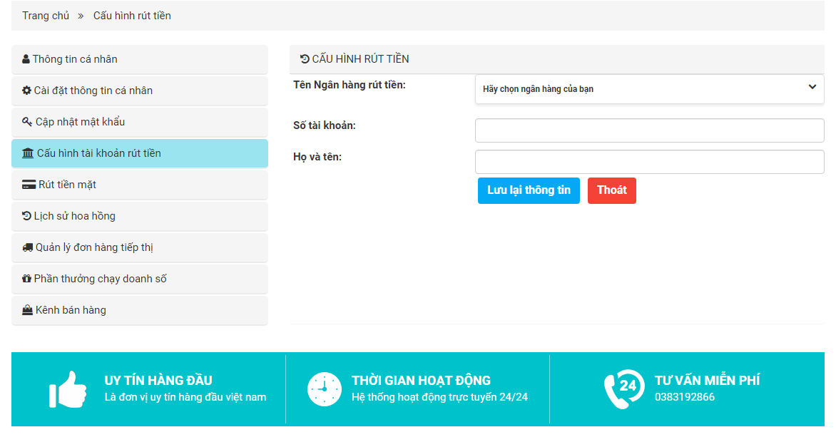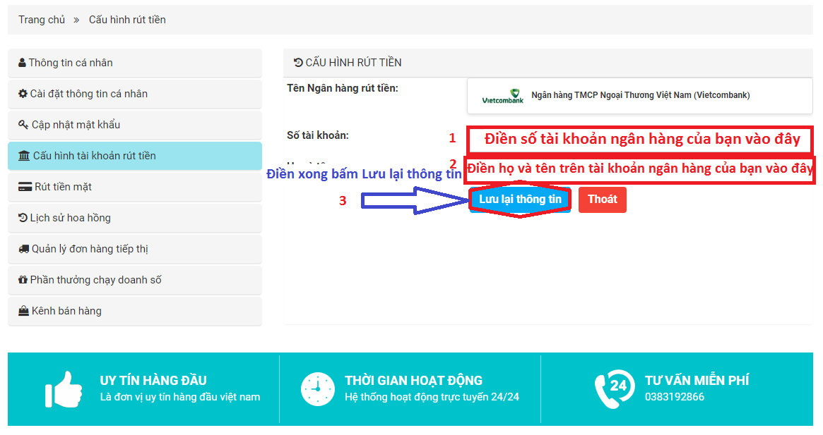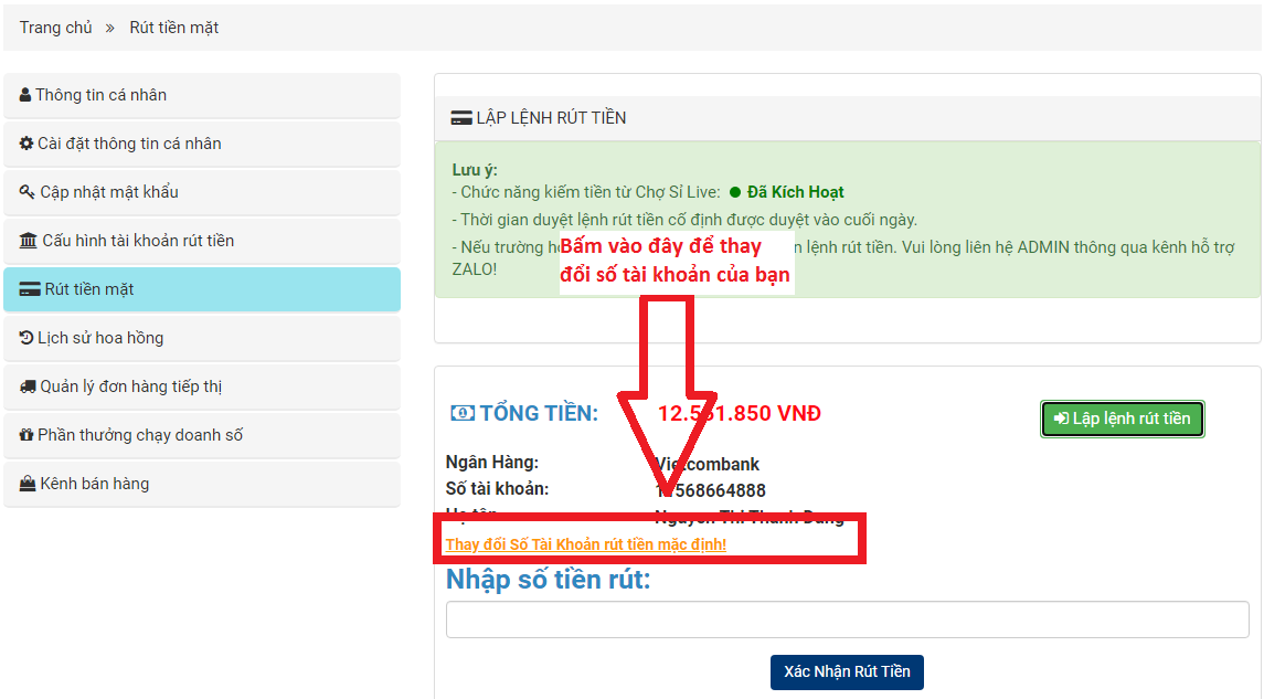 - Cập nhật số tài khoản rút tiền