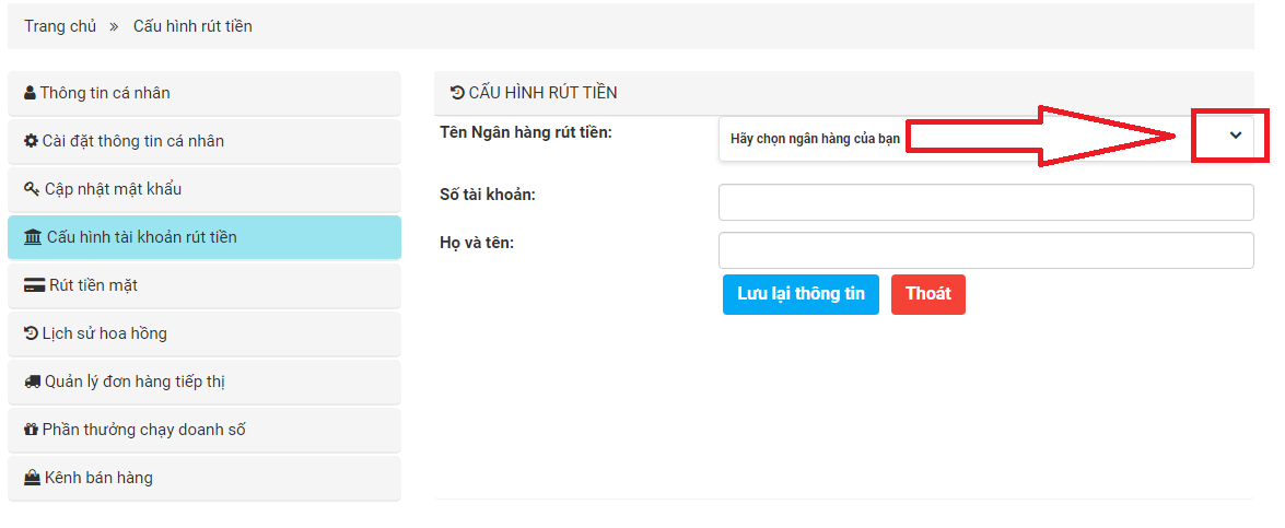 + Bước 2: Bấm vào mục " Cấu hình tài khoản rút tiền"